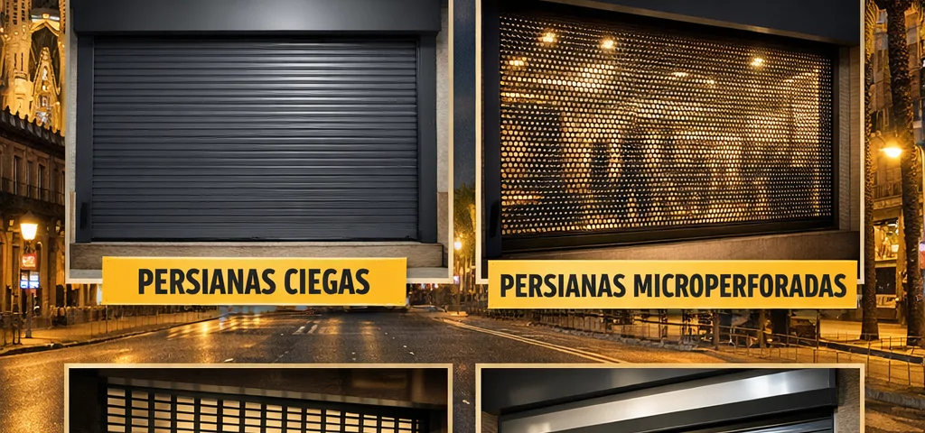 Muy populares en zonas comerciales de alto tránsito en Barcelona, este tipo de persiana combina seguridad y visibilidad. Las pequeñas perforaciones permiten mostrar el interior del negocio incluso cuando está cerrado.